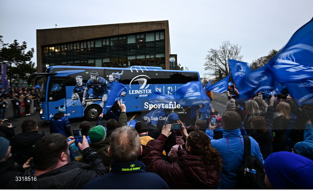 10 January 2026; The Leinster team bus arrives for the Investec Champions Cup match between Leinster and La Rochelle at the Aviva Stadium in Dublin. Photo by Seb Daly/Sportsfile