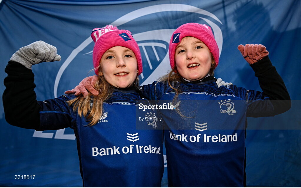 10 January 2026; Leinster supporters Millie, age 7, and Fíadh Hayes, age 6, from Hacketstown, Carlow, before the Investec Champions Cup match between Leinster and La Rochelle at the Aviva Stadium in Dublin. Photo by Seb Daly/Sportsfile