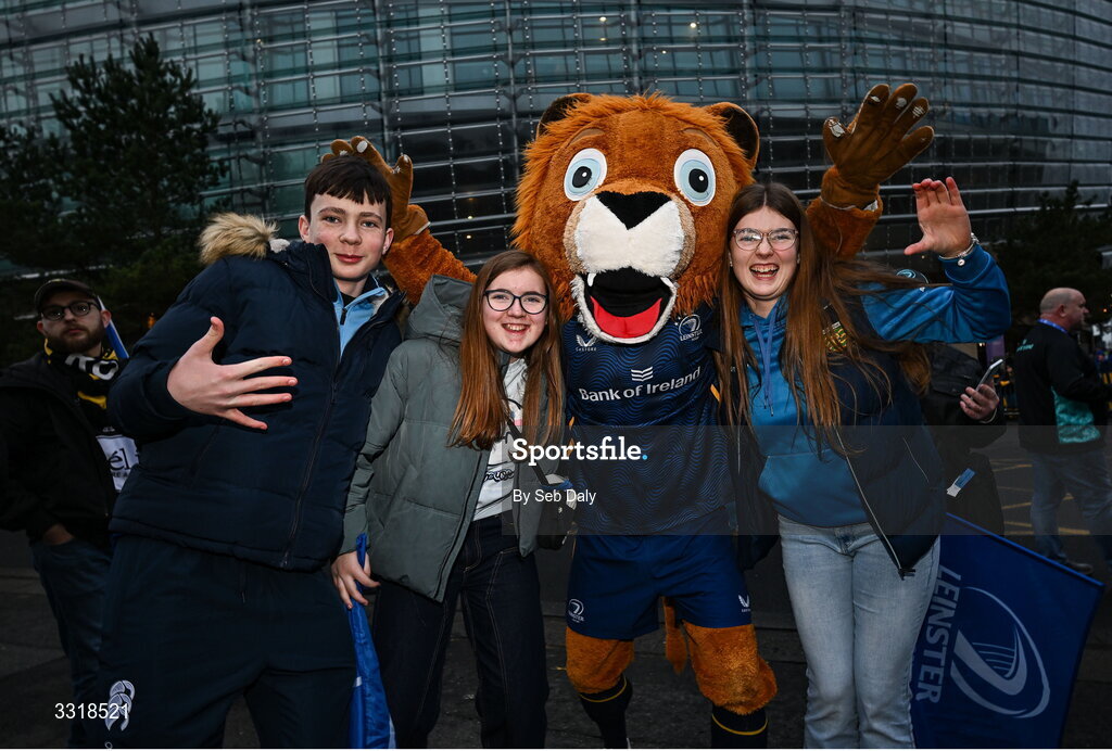 10 January 2026; Leinster mascot Leo the Lion with supporers before the Investec Champions Cup match between Leinster and La Rochelle at the Aviva Stadium in Dublin. Photo by Seb Daly/Sportsfile