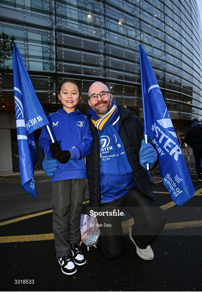 10 January 2026; Leinster supporters Keith Redmond and Emily, age 9, from Lucan, Dublin, before the Investec Champions Cup match between Leinster and La Rochelle at the Aviva Stadium in Dublin. Photo by Seb Daly/Sportsfile