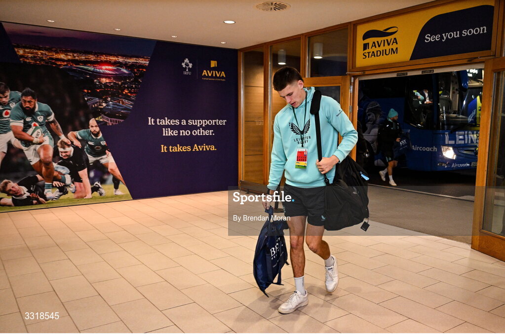 10 January 2026; Sam Prendergast of Leinster arrives for the Investec Champions Cup match between Leinster and La Rochelle at the Aviva Stadium in Dublin. Photo by Brendan Moran/Sportsfile