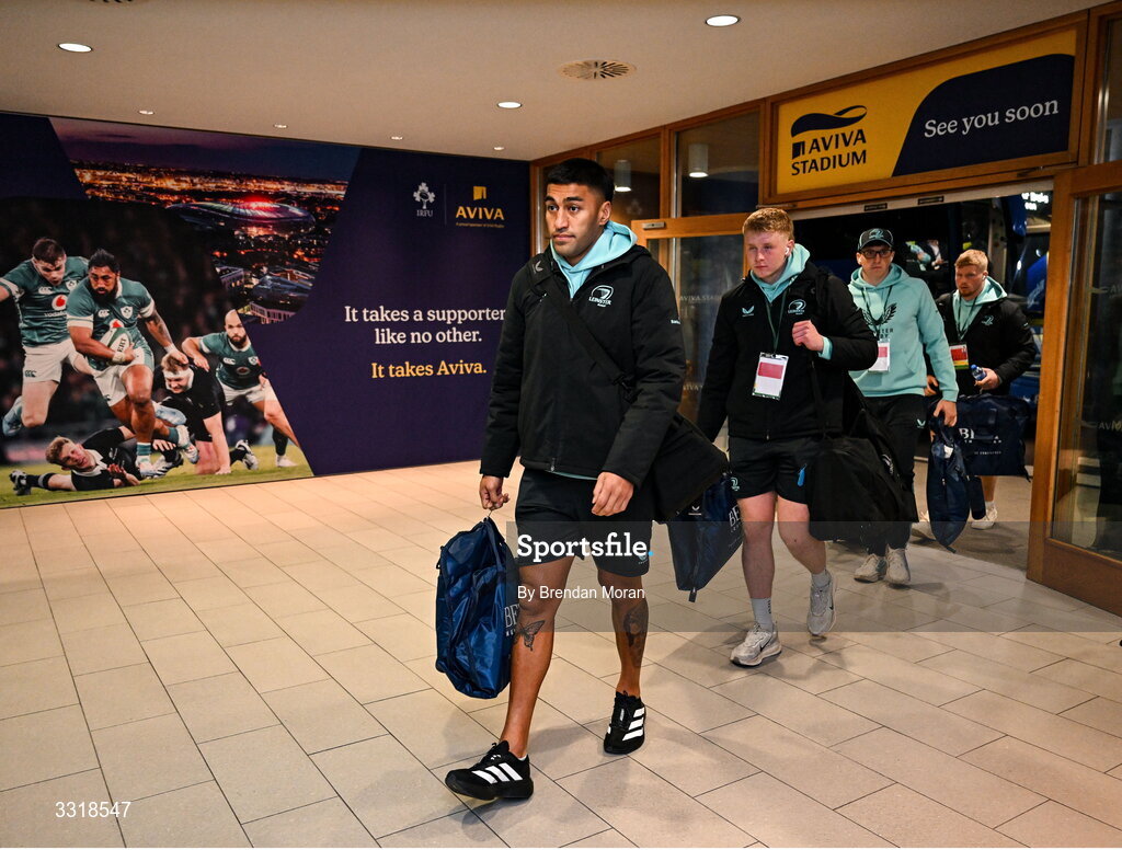 10 January 2026; Rieko Ioane of Leinster and team-mates, including Andrew Osborne, left, arrive for the Investec Champions Cup match between Leinster and La Rochelle at the Aviva Stadium in Dublin. Photo by Brendan Moran/Sportsfile