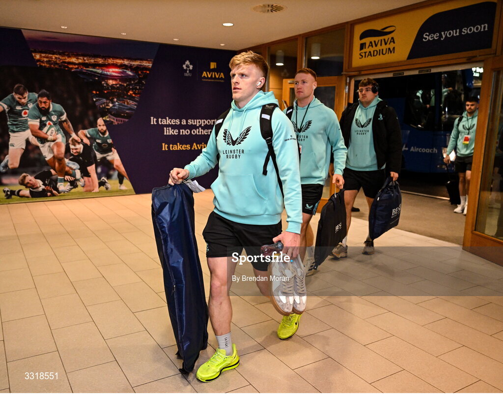 10 January 2026; Tommy O'Brien of Leinster arrives for the Investec Champions Cup match between Leinster and La Rochelle at the Aviva Stadium in Dublin. Photo by Brendan Moran/Sportsfile