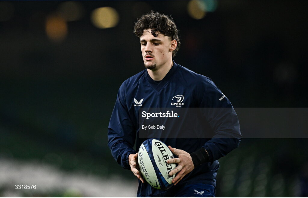 10 January 2026; Joshua Kenny of Leinster warms up before the Investec Champions Cup match between Leinster and La Rochelle at the Aviva Stadium in Dublin. Photo by Seb Daly/Sportsfile