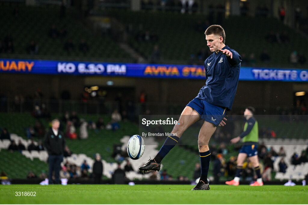 10 January 2026; Sam Prendergast of Leinster warms up before the Investec Champions Cup match between Leinster and La Rochelle at the Aviva Stadium in Dublin. Photo by Brendan Moran/Sportsfile