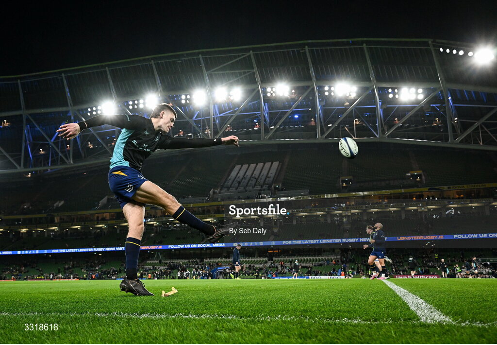 10 January 2026; Sam Prendergast of Leinster warms up before the Investec Champions Cup match between Leinster and La Rochelle at the Aviva Stadium in Dublin. Photo by Seb Daly/Sportsfile