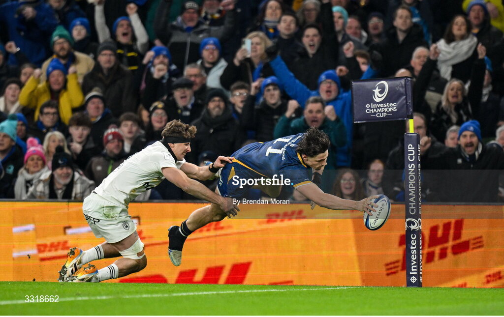 10 January 2026; Joshua Kenny of Leinster dives over to score his side's first try despite the tackle of Oscar Jegou of La Rochelle during the Investec Champions Cup match between Leinster and La Rochelle at the Aviva Stadium in Dublin. Photo by Brendan Moran/Sportsfile
