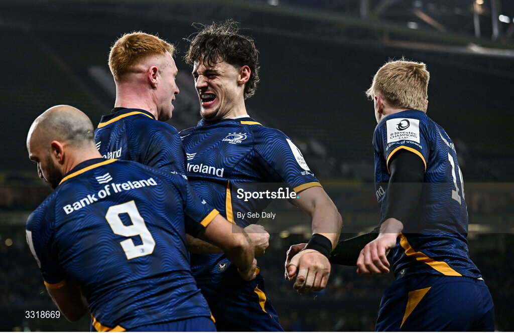10 January 2026; Joshua Kenny, centre, celebrates with Leinster team-mates, including Ciarán Frawley, second from left, and Jamison Gibson-Park, 9, during the Investec Champions Cup match between Leinster and La Rochelle at the Aviva Stadium in Dublin. Photo by Seb Daly/Sportsfile