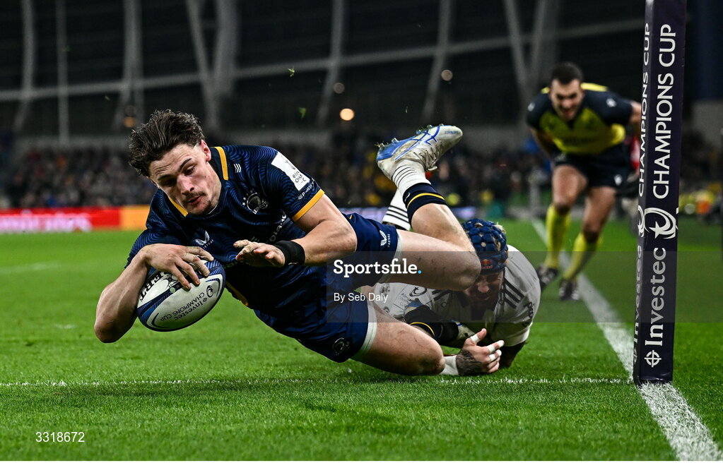 10 January 2026; Joshua Kenny of Leinster scores his side's second try, despite the tackle of Jack Nowell of La Rochelle during the Investec Champions Cup match between Leinster and La Rochelle at the Aviva Stadium in Dublin. Photo by Seb Daly/Sportsfile
