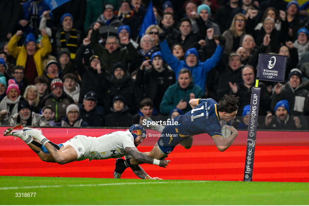 10 January 2026; Joshua Kenny of Leinster scores his, and his side's, second try despite the tackle of Jack Nowell of La Rochelle during the Investec Champions Cup match between Leinster and La Rochelle at the Aviva Stadium in Dublin. Photo by Brendan Moran/Sportsfile