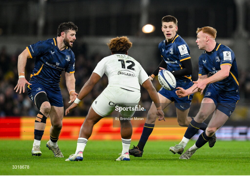 10 January 2026; Leinster players, from right, Ciarán Frawley, Sam Prendergast and Robbie Henshaw in action against Simeli Daunivucu of La Rochelleduring the Investec Champions Cup match between Leinster and La Rochelle at the Aviva Stadium in Dublin. Photo by Brendan Moran/Sportsfile