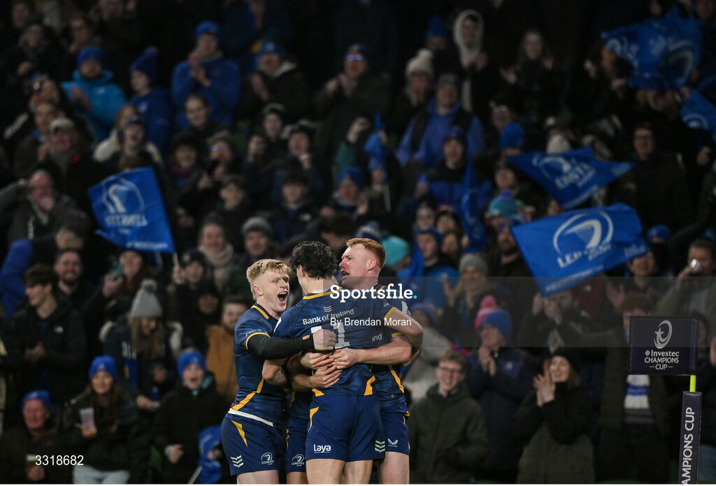 10 January 2026; Joshua Kenny, 11, of Leinster celebrates after scoring his side's opening try with team-mates Tommy O'Brien, left, and Ciarán Frawley, right, during the Investec Champions Cup match between Leinster and La Rochelle at the Aviva Stadium in Dublin. Photo by Brendan Moran/Sportsfile