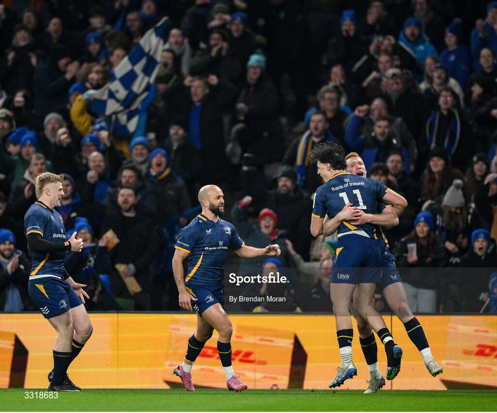 10 January 2026; Joshua Kenny, 11, of Leinster celebrates after scoring his side's opening try with team-mates, from left, Tommy O'Brien, Jamison Gibson-Park and Ciarán Frawley, right, during the Investec Champions Cup match between Leinster and La Rochelle at the Aviva Stadium in Dublin. Photo by Brendan Moran/Sportsfile