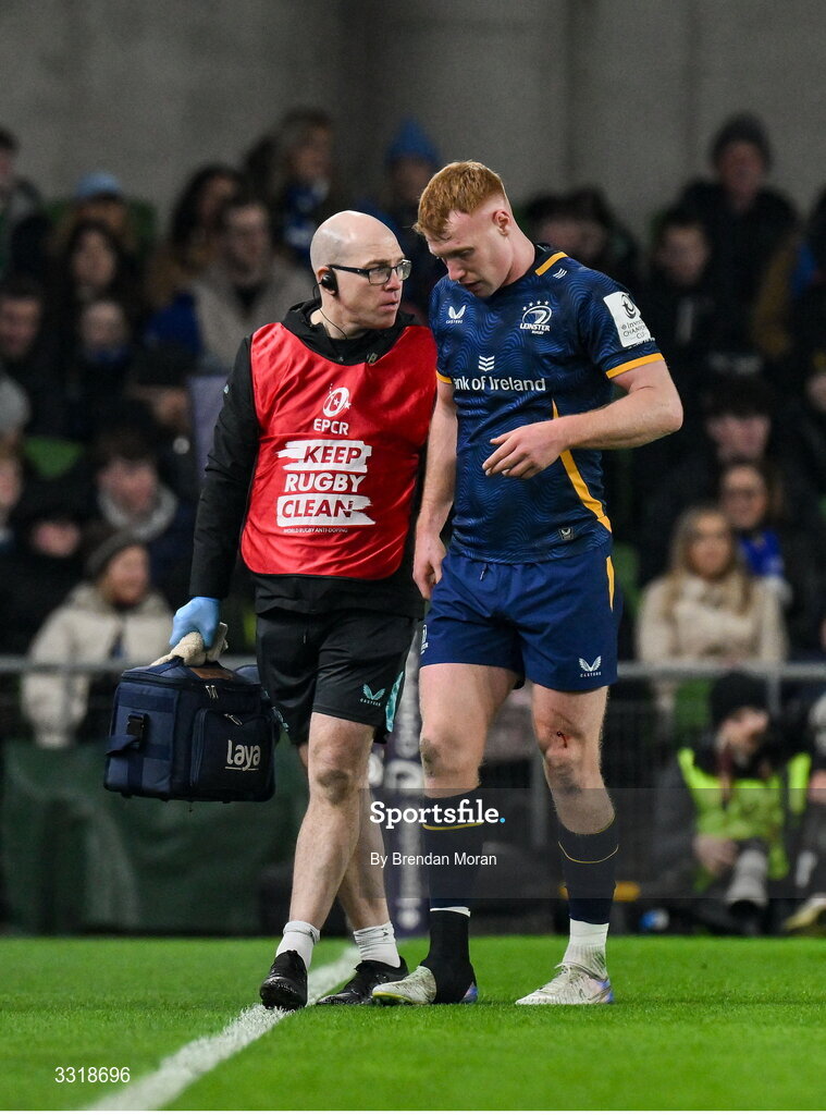10 January 2026; Ciarán Frawley of Leinster leaves the pitch to receive medical attention with team doctor Frank O'Leary during the Investec Champions Cup match between Leinster and La Rochelle at the Aviva Stadium in Dublin. Photo by Brendan Moran/Sportsfile