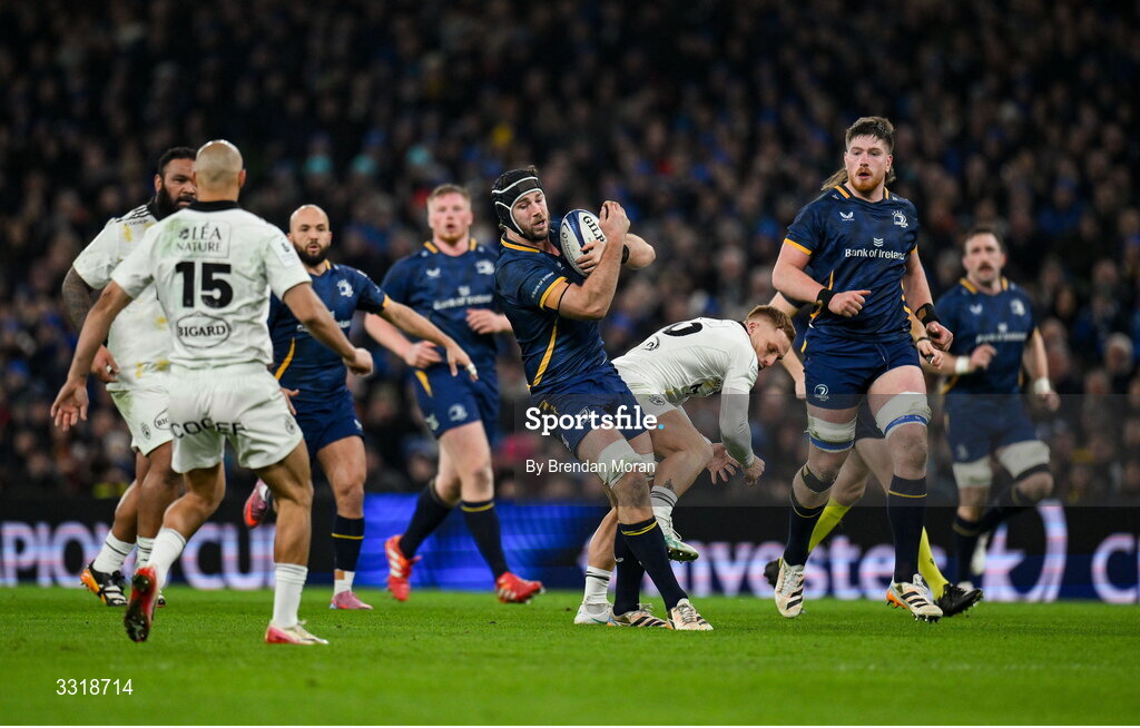 10 January 2026; Caelan Doris of Leinster in action against Ihaia West of La Rochelle during the Investec Champions Cup match between Leinster and La Rochelle at the Aviva Stadium in Dublin. Photo by Brendan Moran/Sportsfile