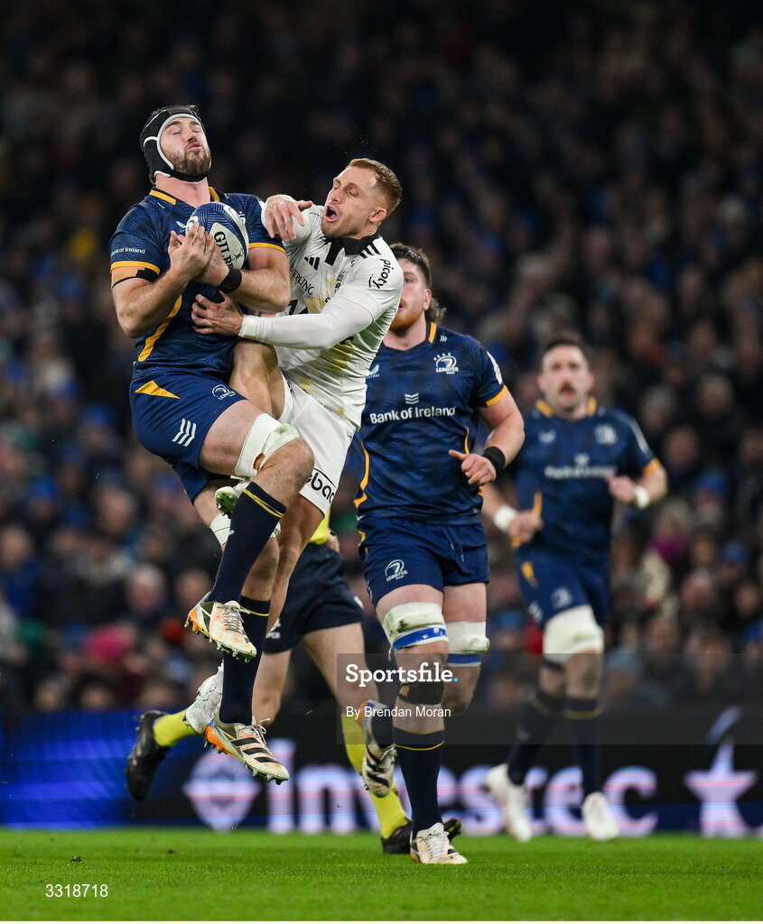 10 January 2026; Caelan Doris of Leinster takes possession ahead of Ihaia West of La Rochelle during the Investec Champions Cup match between Leinster and La Rochelle at the Aviva Stadium in Dublin. Photo by Brendan Moran/Sportsfile