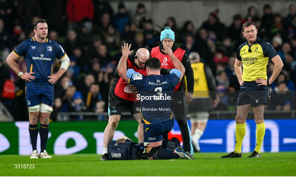 10 January 2026; Thomas Clarkson of Leinster receives medical attention from team doctor Frank O'Leary during the Investec Champions Cup match between Leinster and La Rochelle at the Aviva Stadium in Dublin. Photo by Brendan Moran/Sportsfile