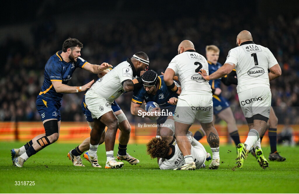 10 January 2026; Caelan Doris of Leinster is tackled by Simeli Daunivucu of La Rochelle during the Investec Champions Cup match between Leinster and La Rochelle at the Aviva Stadium in Dublin. Photo by Brendan Moran/Sportsfile