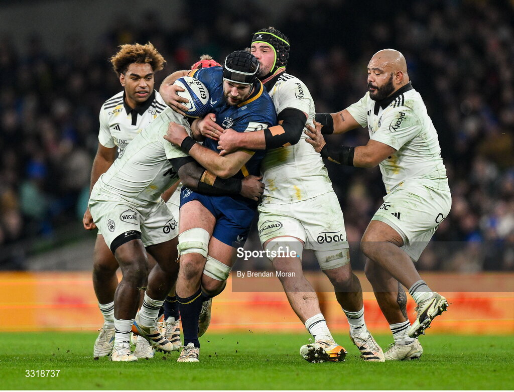 10 January 2026; Caelan Doris of Leinster is tackled by Levani Botia, left, and Grégory Alldritt of La Rochelle during the Investec Champions Cup match between Leinster and La Rochelle at the Aviva Stadium in Dublin. Photo by Brendan Moran/Sportsfile