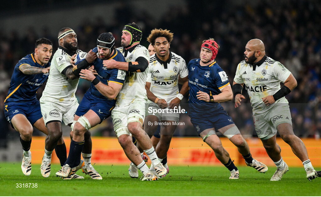 10 January 2026; Caelan Doris of Leinster is tackled by Levani Botia, left, and Grégory Alldritt of La Rochelle during the Investec Champions Cup match between Leinster and La Rochelle at the Aviva Stadium in Dublin. Photo by Brendan Moran/Sportsfile
