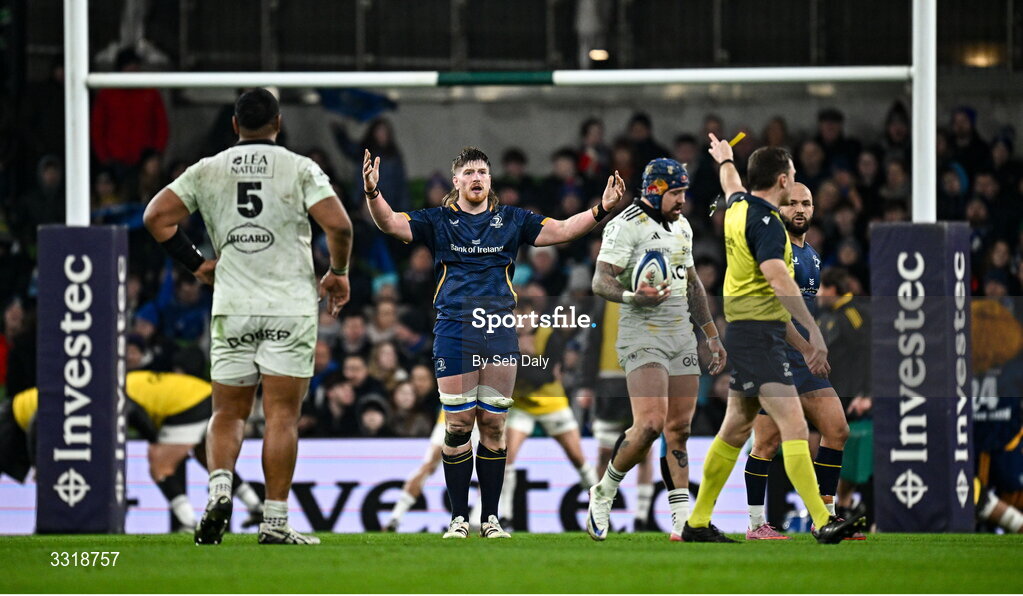 10 January 2026; Joe McCarthy of Leinster reacts after being showing a yellow card by referee Matthew Carley during the Investec Champions Cup match between Leinster and La Rochelle at the Aviva Stadium in Dublin. Photo by Seb Daly/Sportsfile