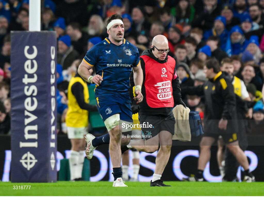 10 January 2026; Jack Conan of Leinster leaves the pitch with team doctor Frank O'Leary to receive medical attention during the Investec Champions Cup match between Leinster and La Rochelle at the Aviva Stadium in Dublin. Photo by Brendan Moran/Sportsfile