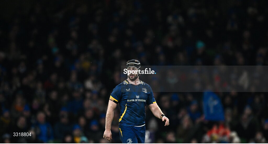 10 January 2026; Caelan Doris of Leinster after his side conceded a second try during the Investec Champions Cup match between Leinster and La Rochelle at the Aviva Stadium in Dublin. Photo by Seb Daly/Sportsfile