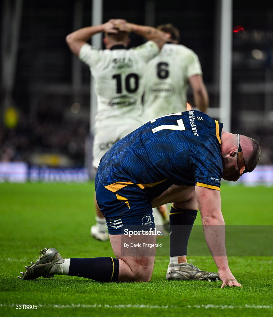 10 January 2026; Jerry Cahir of Leinster after his side conceded a second try during the Investec Champions Cup match between Leinster and La Rochelle at the Aviva Stadium in Dublin. Photo by David Fitzgerald/Sportsfile