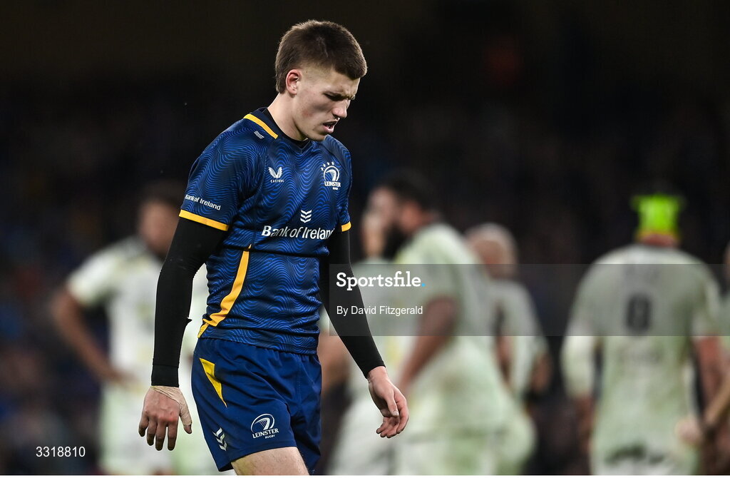 10 January 2026; Sam Prendergast of Leinster during the Investec Champions Cup match between Leinster and La Rochelle at the Aviva Stadium in Dublin. Photo by David Fitzgerald/Sportsfile