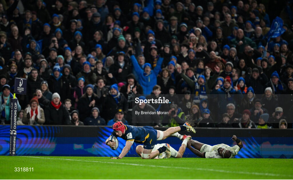 10 January 2026; Josh van der Flier of Leinster scores his side's third try during the Investec Champions Cup match between Leinster and La Rochelle at the Aviva Stadium in Dublin. Photo by Brendan Moran/Sportsfile