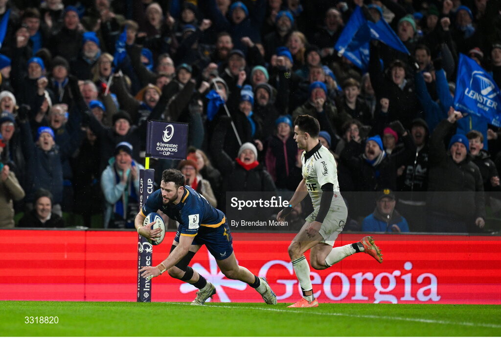 10 January 2026; Robbie Henshaw of Leinster scores his side's fourth try during the Investec Champions Cup match between Leinster and La Rochelle at the Aviva Stadium in Dublin. Photo by Brendan Moran/Sportsfile