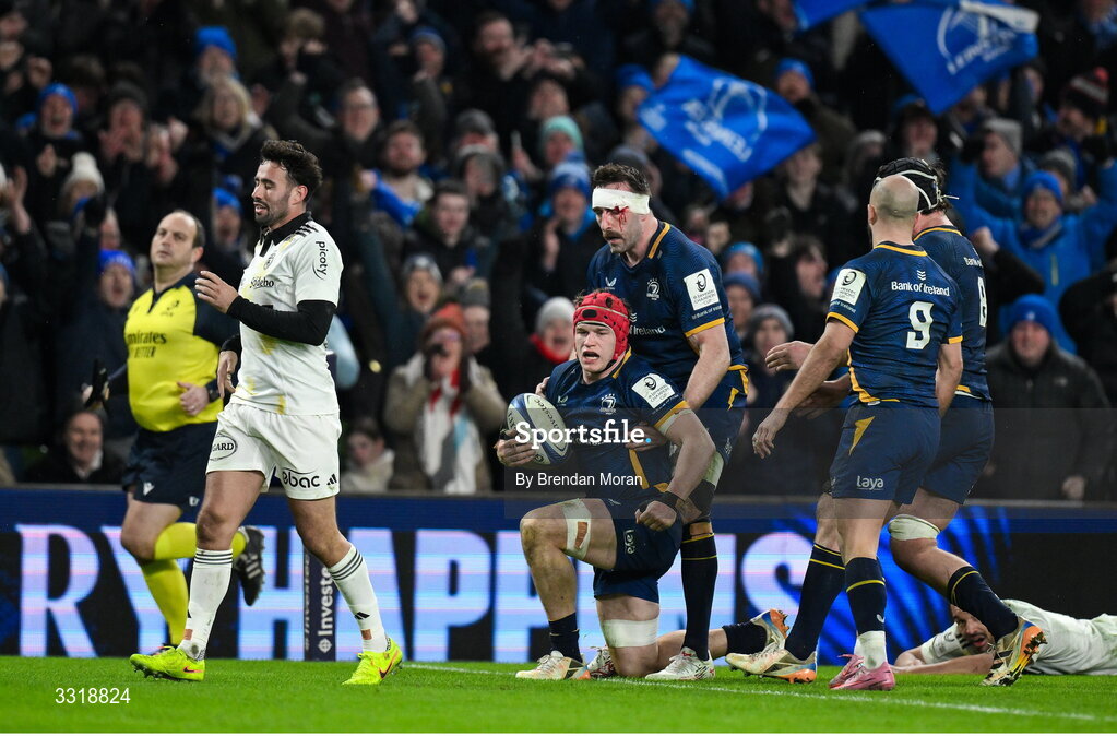 10 January 2026; Josh van der Flier of Leinster celebrates with team-mate Jack Conan, right, after scoring his side's third try during the Investec Champions Cup match between Leinster and La Rochelle at the Aviva Stadium in Dublin. Photo by Brendan Moran/Sportsfile