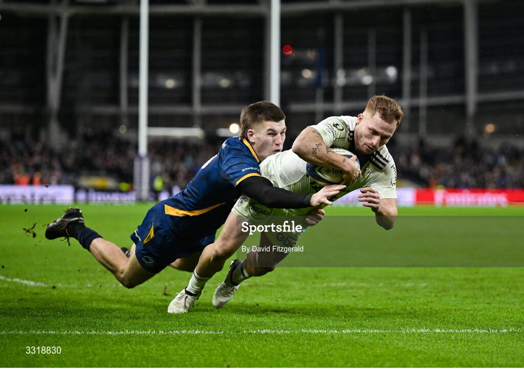 10 January 2026; Ihaia West of La Rochelle scores his side's third try despite the tackle of Sam Prendergast of Leinster during the Investec Champions Cup match between Leinster and La Rochelle at the Aviva Stadium in Dublin. Photo by David Fitzgerald/Sportsfile