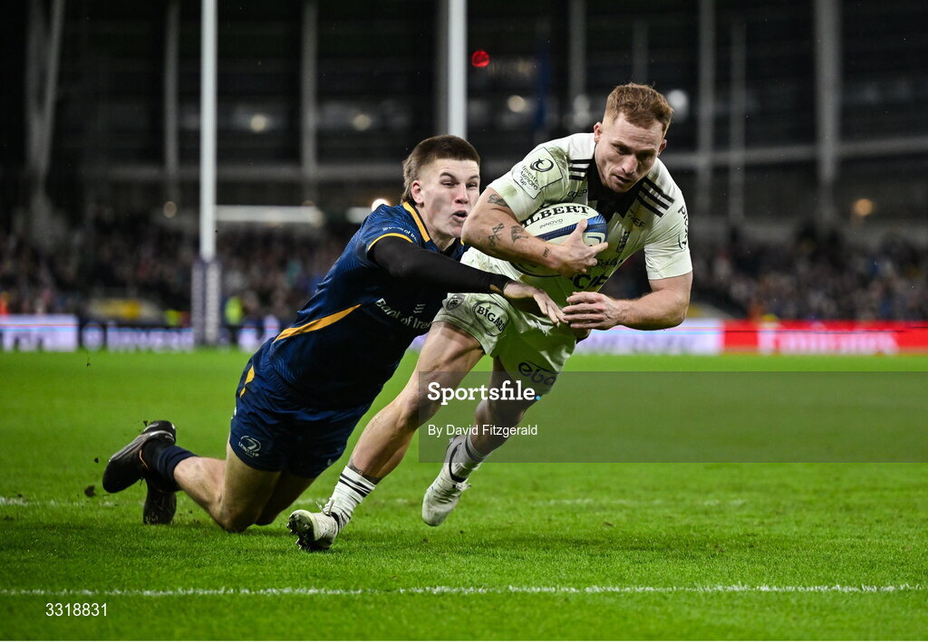 10 January 2026; Ihaia West of La Rochelle scores his side's third try despite the tackle of Sam Prendergast of Leinster during the Investec Champions Cup match between Leinster and La Rochelle at the Aviva Stadium in Dublin. Photo by David Fitzgerald/Sportsfile