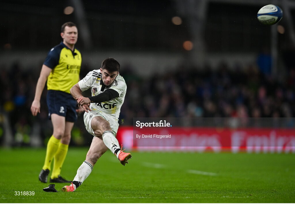 10 January 2026; Nolann le Garrec of La Rochelle kicks a conversion in the 77th minute during the Investec Champions Cup match between Leinster and La Rochelle at the Aviva Stadium in Dublin. Photo by David Fitzgerald/Sportsfile