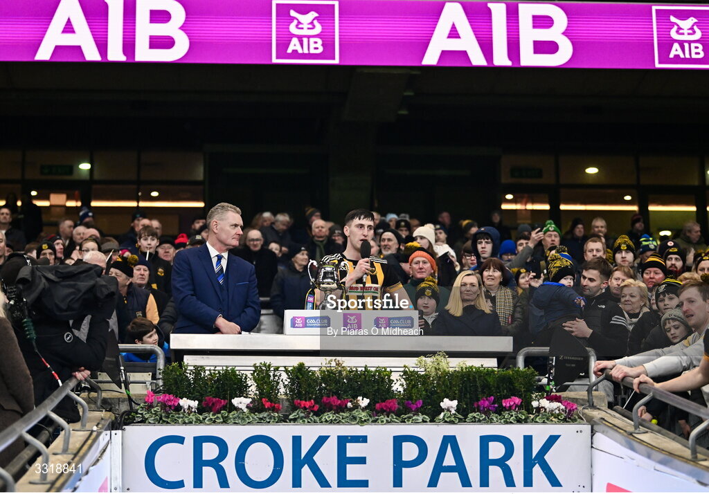 10 January 2026; Upperchurch-Drombane captain Keith Ryan makes a speech after his side's victory in the AIB GAA Hurling All-Ireland Intermediate Club Championship final match between Tooreen of Mayo and Upperchurch-Drombane of Tipperary at Croke Park in Dublin. Photo by Piaras Ó Mídheach/Sportsfile