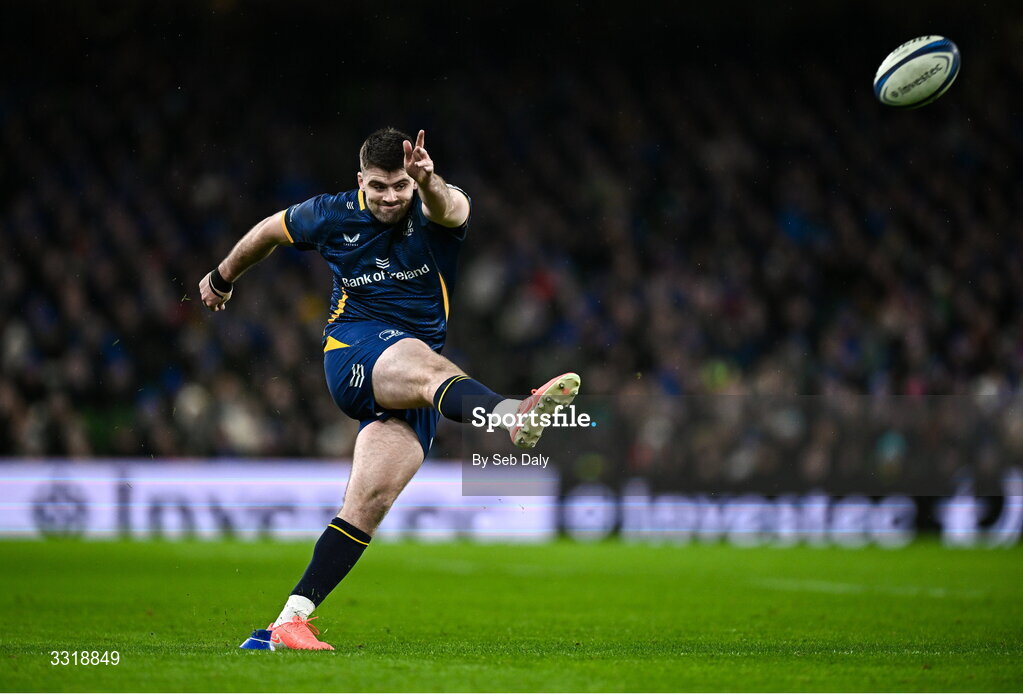 10 January 2026; Harry Byrne of Leinster converts an 80th minute penalty to give his side a 25-24 victory during the Investec Champions Cup match between Leinster and La Rochelle at the Aviva Stadium in Dublin. Photo by Seb Daly/Sportsfile