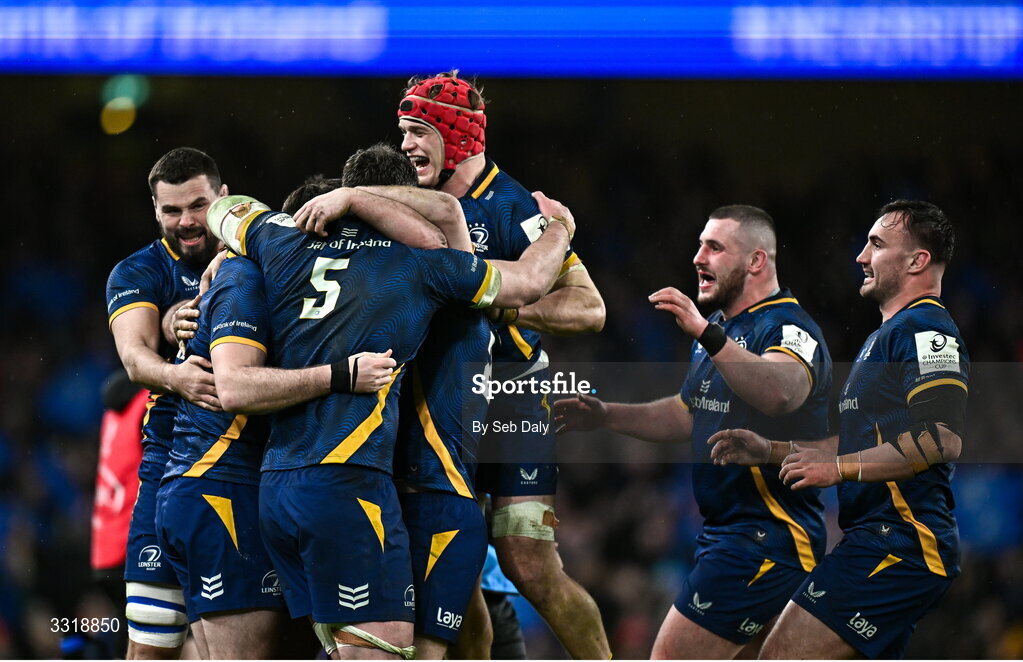 10 January 2026; Leinster players celebrate after Harry Byrne, hidden, converted an 80th minute penalty to give his side a 25-24 victory during the Investec Champions Cup match between Leinster and La Rochelle at the Aviva Stadium in Dublin. Photo by Seb Daly/Sportsfile