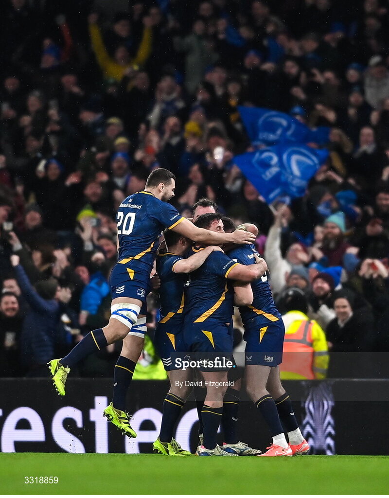 10 January 2026; Leinster players celebrate after Harry Byrne converted an 80th minute penalty to give his side a 25-24 victory during the Investec Champions Cup match between Leinster and La Rochelle at the Aviva Stadium in Dublin. Photo by David Fitzgerald/Sportsfile