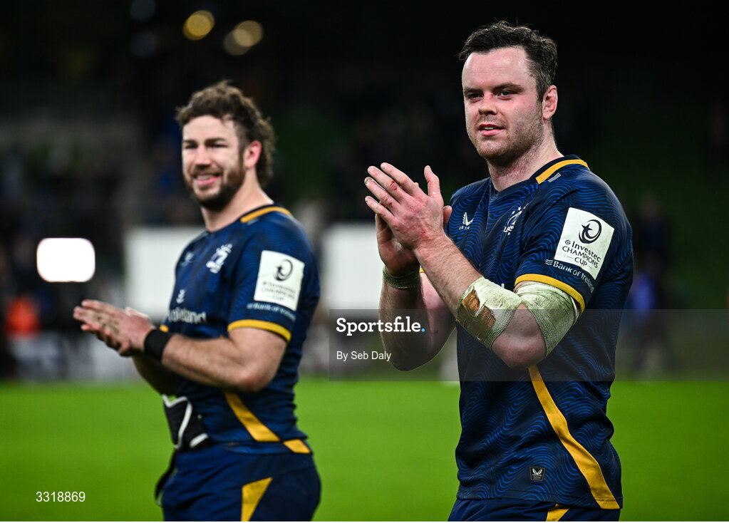 10 January 2026; James Ryan, right, and Caelan Doris of Leinster after the Investec Champions Cup match between Leinster and La Rochelle at the Aviva Stadium in Dublin. Photo by Seb Daly/Sportsfile