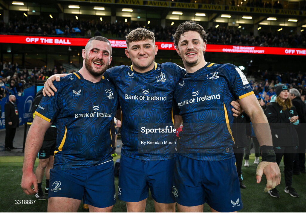 10 January 2026; Leinster players, from left, Jerry Cahir, Andrew Sparrow and Joshua Kenny after the Investec Champions Cup match between Leinster and La Rochelle at the Aviva Stadium in Dublin. Photo by Brendan Moran/Sportsfile
