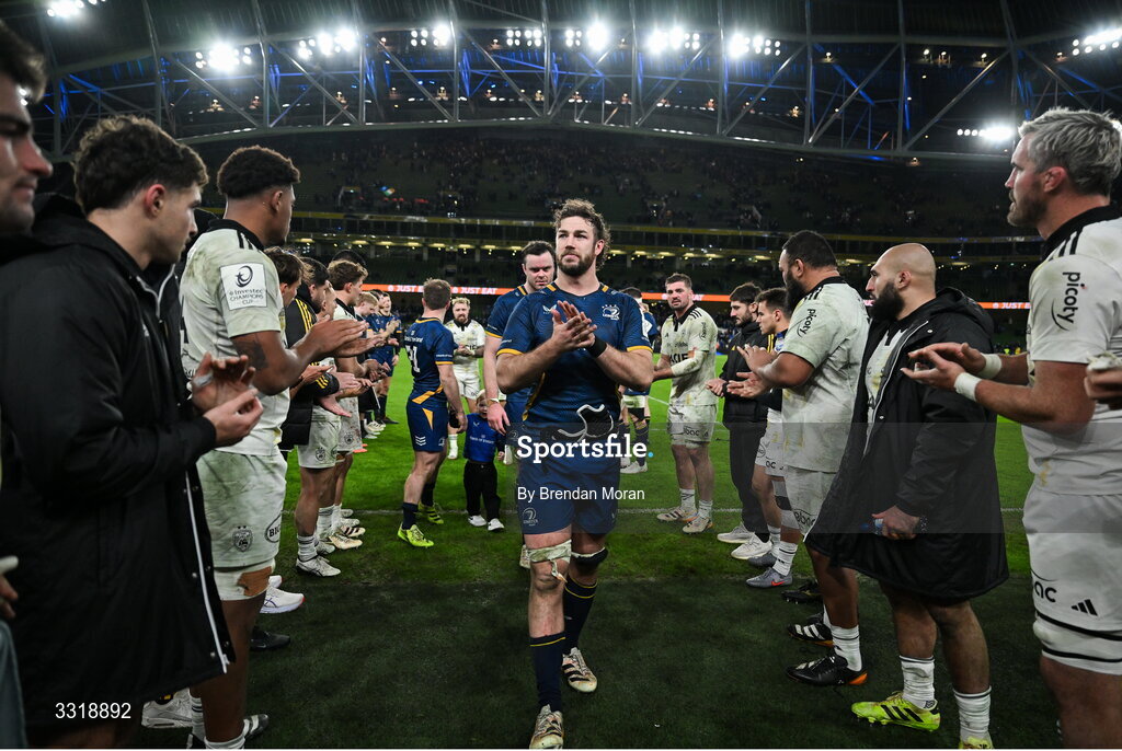 10 January 2026; Leinster captain Caelan Doris leads his side off after the Investec Champions Cup match between Leinster and La Rochelle at the Aviva Stadium in Dublin. Photo by Brendan Moran/Sportsfile