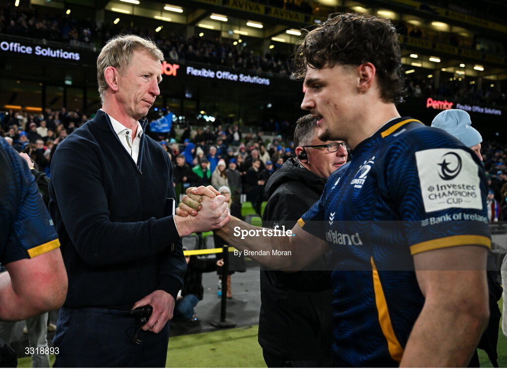 10 January 2026; Leinster head coach Leo Cullen and Joshua Kenny after the Investec Champions Cup match between Leinster and La Rochelle at the Aviva Stadium in Dublin. Photo by Brendan Moran/Sportsfile