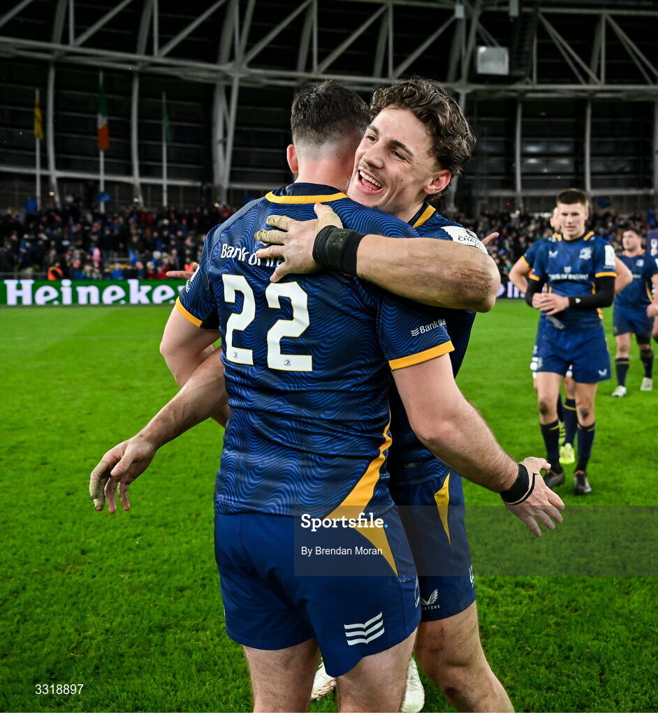 10 January 2026; Joshua Kenny, right, and Harry Byrne, 22, of Leinster celebrate after the Investec Champions Cup match between Leinster and La Rochelle at the Aviva Stadium in Dublin. Photo by Brendan Moran/Sportsfile
