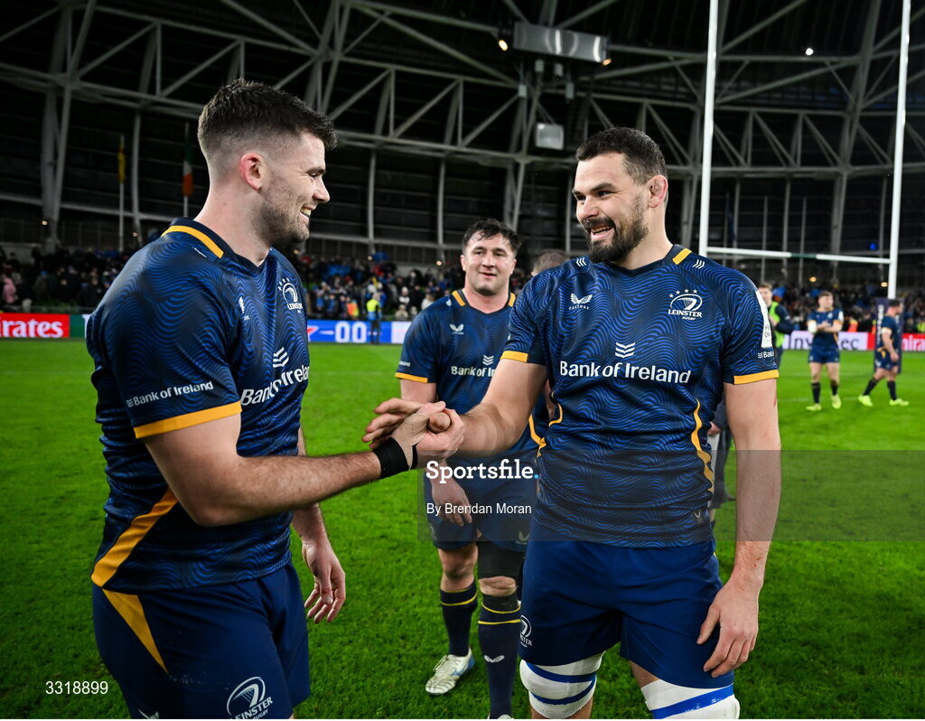 10 January 2026; Harry Byrne, left, and Max Deegan of Leinster after the Investec Champions Cup match between Leinster and La Rochelle at the Aviva Stadium in Dublin. Photo by Brendan Moran/Sportsfile