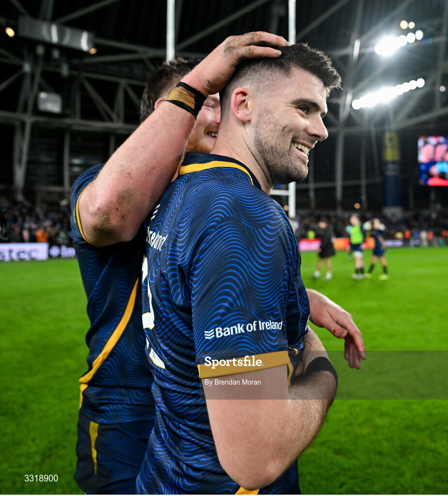10 January 2026; Harry Byrne of Leinster is congratulated by Joe McCarthy, left, after the Investec Champions Cup match between Leinster and La Rochelle at the Aviva Stadium in Dublin. Photo by Brendan Moran/Sportsfile