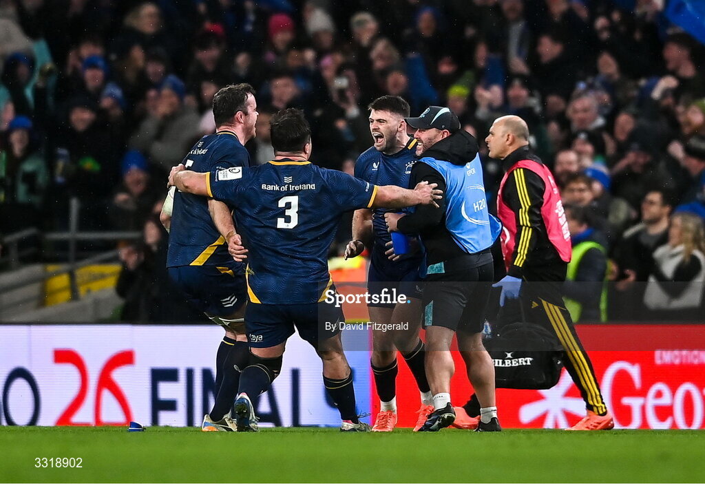 10 January 2026; Harry Byrne of Leinster celebrates with team-mates James Ryan, left, Thomas Clarkson, 3, and kicking coach Emmet Farrell converts an 80th minute penalty to give his side a 25-24 victory during the Investec Champions Cup match between Leinster and La Rochelle at the Aviva Stadium in Dublin. Photo by David Fitzgerald/Sportsfile