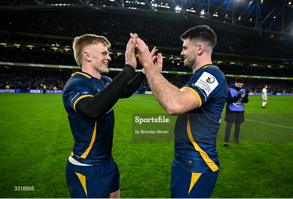 10 January 2026; Tommy O'Brien, left, and Harry Byrne of Leinster celebrate after the Investec Champions Cup match between Leinster and La Rochelle at the Aviva Stadium in Dublin. Photo by Brendan Moran/Sportsfile