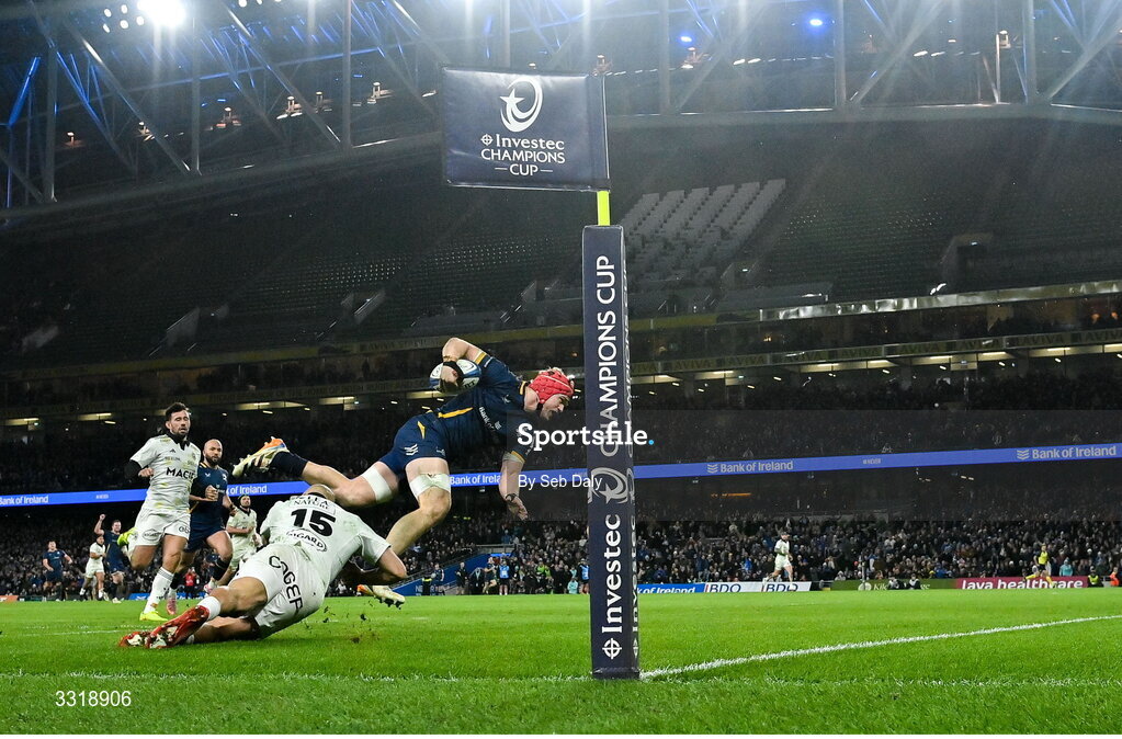 10 January 2026; Josh van der Flier of Leinster scores his side's third try during the Investec Champions Cup match between Leinster and La Rochelle at the Aviva Stadium in Dublin. Photo by Seb Daly/Sportsfile