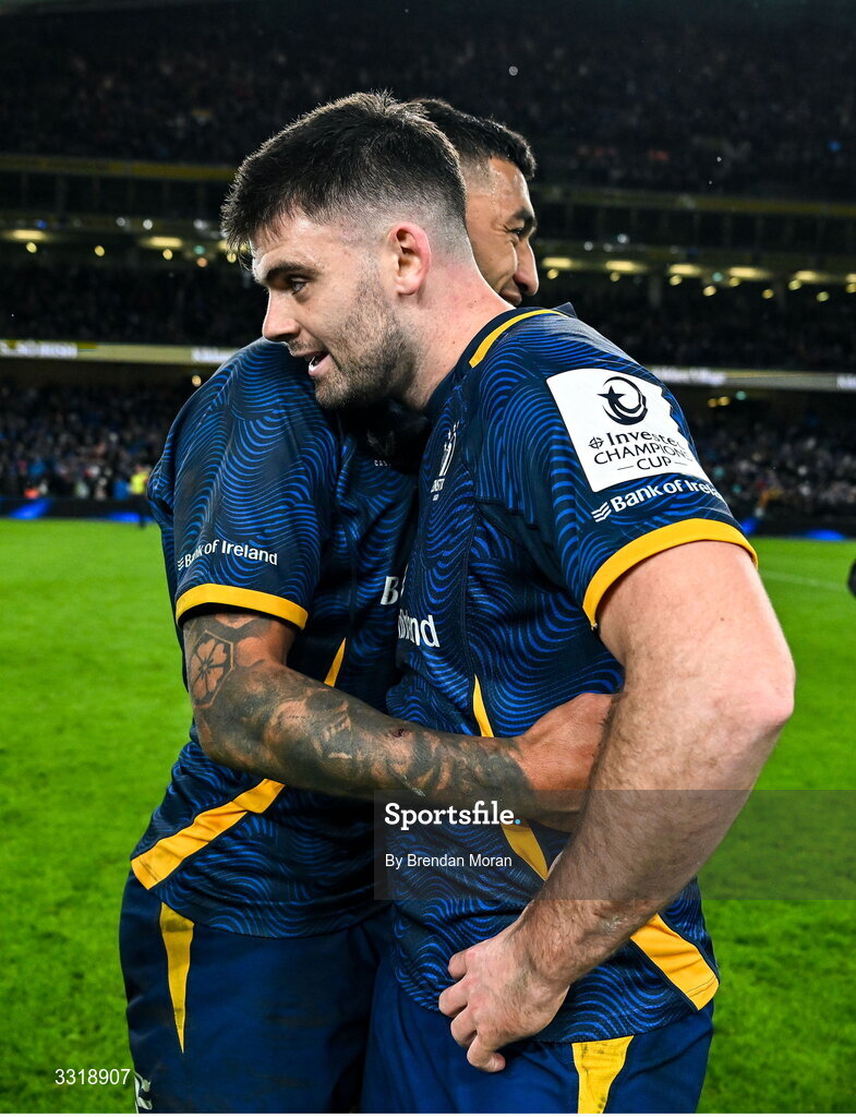 10 January 2026; Harry Byrne celebrates with Leinster team-mate Rieko Ioane after the Investec Champions Cup match between Leinster and La Rochelle at the Aviva Stadium in Dublin. Photo by Brendan Moran/Sportsfile